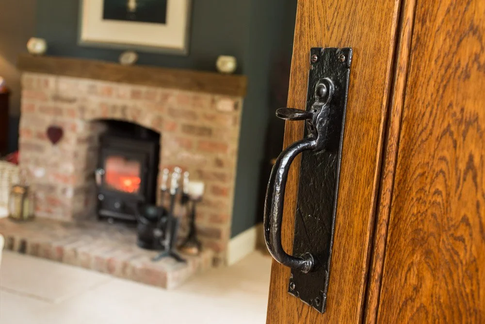 We have also supplemented this main shot of the room with a detail shot, as the vendor requested we make a feature of the cast-iron thumb latch and wooden doors that lead in to the living room as below…