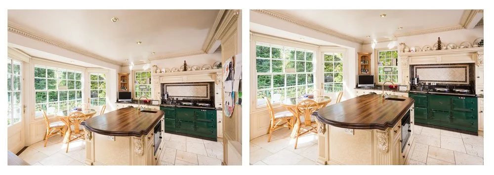 In this kitchen example shooting wider doesn’t make the room look bigger, nicer or make for a better photograph. What it does show is a radiator, children’s drawings, a bit of random worktop and acres and acres of plasterboard ceiling. All that extra uninteresting stuff means the main features of the room; the AGA, island and view onto the garden are smaller in frame.